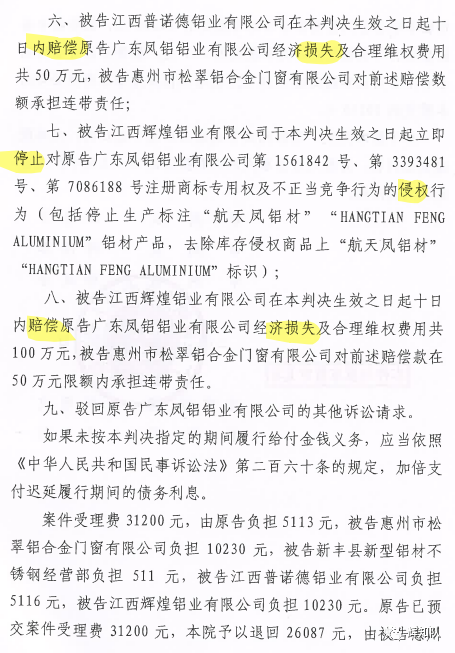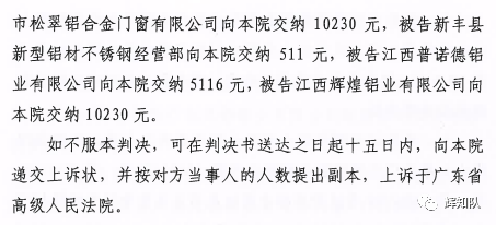 南平凤铝系列维权案:诉辉煌公司等四被告,法院判赔250余万